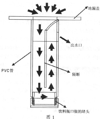 一到夏天,惡臭就從地漏里傳來,而且很多小蟲子也從地漏里飛出來,很惡心,相信很多家庭都遇到了這種情況,我家就遇到了這種情況,讓家里人很頭疼。爸爸本想換一個好一點兒的地漏,可這個地漏被水泥砌得很結(jié)實,怎么都拿不出來。我想,還是把這個地漏改造一下吧。密封不好是這個地漏的主要缺陷,如何能嚴(yán)密堵住下水道里的臭氣,并且還能讓地面上的水順利地流下去呢?一天,我看見爸爸用一根長管子給魚缸換水,在水管的U 形彎曲處總是有水存在。我想,水是可用于密封的液體,它不僅能堵住空氣,而且還有很好的流動性。這里的水就能很好地把抽水管堵住,如果一頭的壓力大還能把水排出去。這不正是我想要的效果嗎?于是,我就設(shè)計了水封式防臭地漏(圖 1)。